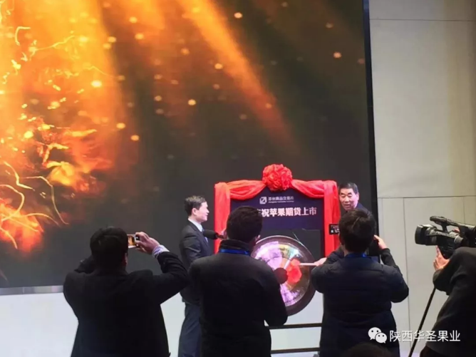 万众瞩目的苹果期货合约于2017年12月22日在郑州商品交易所正式挂牌交易。陕西华圣企业(集团)股份有限公司.果业公司做为企业代表参加了上市仪式。证监会副主席方星海等领导出席现场发布仪式,华圣果业总经理孙晓冰受邀出席并代表全国苹果经营企业发言。华圣交割代码Ap1801