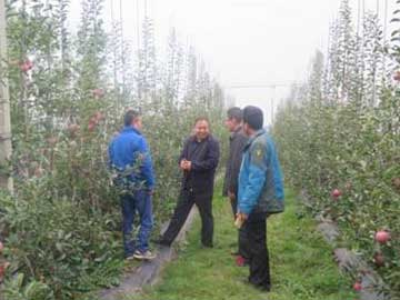 10月16日甘肃省天水市秦安县2016年新型职业农民培育工程苹果生产经营培训班大约70人前来宝鸡华圣基地参观。宝鸡华圣的技术员带领大家进行了参观,并对柿沟基地的基本情况进行了介绍。 柿沟基地的苹果树是2014年种植的,到目前我们由国外引进的嘎啦系列(巴克艾和密谢啦)、富士系列等已经种植成功,第一年亩产量在400-500公斤,第二年亩产量达到800-1500公斤。这说明我们种植的矮化自根砧种苗除了易管理外,产量是大大提高了。 果农朋友看到我们矮砧密植的种植模式和生产方式表示赞许,对自根砧M9-T337,水肥一体化的滴管模式表现浓厚的兴趣,纷纷咨询,技术员给予详细的讲解。 果农朋友纷纷研究起我们种植模式 随后技术员还介绍了通过两年时间培育出平均带有12个分枝的4A级大苗,高度1.8m以上M9-T337矮化自根砧大苗,在苗圃完成整形,建园当年即可开花结果的成果。通过这样的建园方式和种植模式,完全打破了传统的建园方式。 还有我们的压条圃,通过讲解终于了解到,自根砧是怎么种植的 最后来到机械库房,公司目前从意大利荷兰引进了苗木种植机,起苗机,锯末覆盖机,砧木刷根机,果园弥雾机,混药剂,割草机,果园多功能操作平台,专用拖拉机等苗圃基地配套设备30余台,其中20余台设备为国内首次引进。 技术人员还现场演示了多功能果园操作平台,果农朋友面对这些先进的设备表示赞许。各类新设备的引进和使用不仅大大降低了劳动成本,提高了工作效益,更重要的是在中国农业领域起到示范效应。
