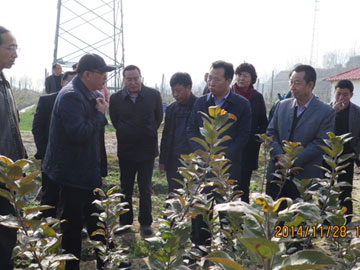 2014年12月23日,宝鸡市市委副书记陈光明在千阳县县委书记郝晋升及县长何玲的陪同下,视察了宝鸡华圣果业有限责任公司崔家头种植基地和柿沟苗木基地。公司副总经理史继东向各位领导介绍了基地建设情况和公司未来发展规划。参观期间,苗圃正在进行冬季起苗,陈书记询问了品种嫁接及苗木贮藏等有关情况,并就苗木未来发展与相关人员进行深入交流。在参观种植基地时,给予了充分肯定。 华圣果业崔家头苹果种植基地一期建设征地3000亩,选用进口大苗建园,从欧洲引进果园专用拖拉机、风送弥雾机等机械设备,配备远程遥控、检测、测报设备,实现机械化、自动化、标准化。柿沟苗木基地一期征地2000亩,先后建立了砧木原种圃、砧木压条繁育圃、种质资源圃、品种采穗圃、大苗繁育圃、品种展示园、组培脱毒快繁试验区等。引进了欧洲AA级大苗培育标准和生产操作规程,严格按照该标准生产无病毒、自根砧分枝大苗,保证苗木生产质量。
