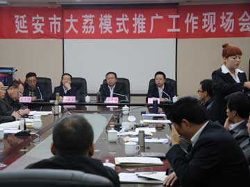 2013年10月30日至31日,“延安大荔模式观摩暨推广工作现场会”在富县延安华圣三农科技服务公司举行。此次会议由延安市科技局组织,参会人员包括延安市科技局党组书记、局长刘宝霖,局党组副书记、副局长白建宏,富县政府副县长王冬梅,延安市科技局副调研员马润波,富县科技局局长周立群,陕西华圣果业副总经理佘均安,宜川荔民农资连锁运营中心经理张文科以及延安市财政局、农业局、林业局、畜牧局等相关部门的负责人、各县区科技局局长、“大荔模式”推广企业负责人等。 30日下午15时,由白建宏带队在延安华圣三农科技服务公司“大荔模式”推广县级总站,乡级总站及村级总站观摩并召开现场会,观摩现场人头攒动。三农公司副总经理张林做了公司“大荔模式”推广工作整体汇报,具体介绍了“六县一区”业务的覆盖范围、流程以及操作规范,取得的重大成绩。并针对目前华圣“大荔模式“实施情况所需要的技术支撑提出了建议。 31日上午8时30分,在富县宾馆举行了“延安大荔模式推广”工作会。会上王冬梅副县长致词,欢迎各位领导及嘉宾参加此次会议,并预祝大会圆满成功。马润波副调研员宣读《延安市科学技术局关于加快农技服务大荔模式推广工作的意见》。富县科技局局长周立群、陕西华圣果业副总佘均安、宜川荔民农资连锁运营中心经理张文科分别交流推广大荔模式工作经验。最后,由刘宝霖局长总结过去推广工作,分析了推广工作中存在的问题和不足,全面详细地安排了全市大荔模式推广工作和农村科技服务体系建设工作。会议中刘宝霖局长高度评价及肯定了华圣三农公司推广大荔模式工作及在延安所取得的成绩。