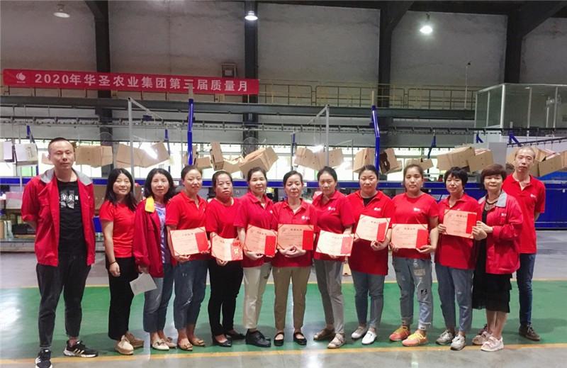 2020年6-7月,华圣农业集团第三届质量月活动如期举行,本届质量月的主题是“加强新工培训、降低新工出错率;开展质量竞赛活动,提高全员质量意识”。质量月开展期间,技术质量部制定了详细的新工的培训方案,将所到岗的新工分给指定检验员,检验人员培训包干制,进行分阶段的培训指导和考核,每个阶段考核合格了方可开展下一阶段的培训,最终使得所有新工都达到岗位目标要求,出错率降低了73.7%。在果业工厂开展了轰轰烈烈的质量竞赛,车间员工高度重视质量,大家你追我赶,最终生产不合格率1.1%,小伤2.4%;发货不合格率3.5%,发货小伤6.7%,圆满完成既定目标。8月14日上午,在华圣农业集团果业工厂车间举行了“华圣农业集团第三届质量月表彰大会”。果业工厂副厂长徐小宁,技术质量部部长王颖为获奖人员颁发了荣誉证书和奖金。“质量月”活动在我司已经连续开展三年,在这三年时间里,一年一个台阶,质量管理工作得到了持续的提升。愿我们继续保持质量月期间的优良成绩,长期树立质量意识,以良好的质量为船,树立起品牌之帆,远航在市场的最前沿。